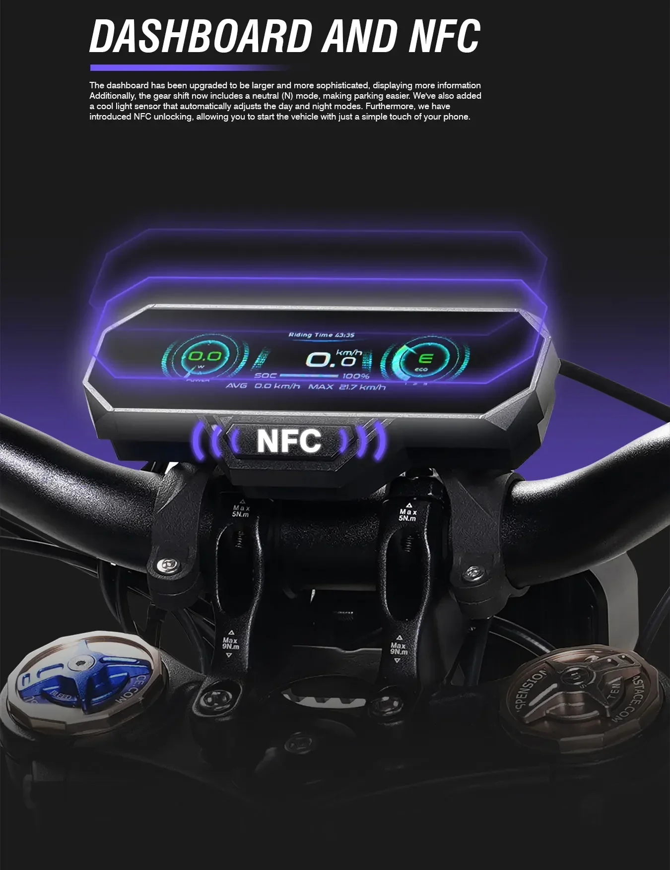 (1) El tablero se ha actualizado para que sea más grande y sofisticado, mostrando más informativos.Además, la mierda de engranajes ahora incluye un modo neutro (N), lo que facilita el estacionamiento.También hemos agregado un sensor de luz fría que ajusta automáticamente los modos diurno y nocturno.