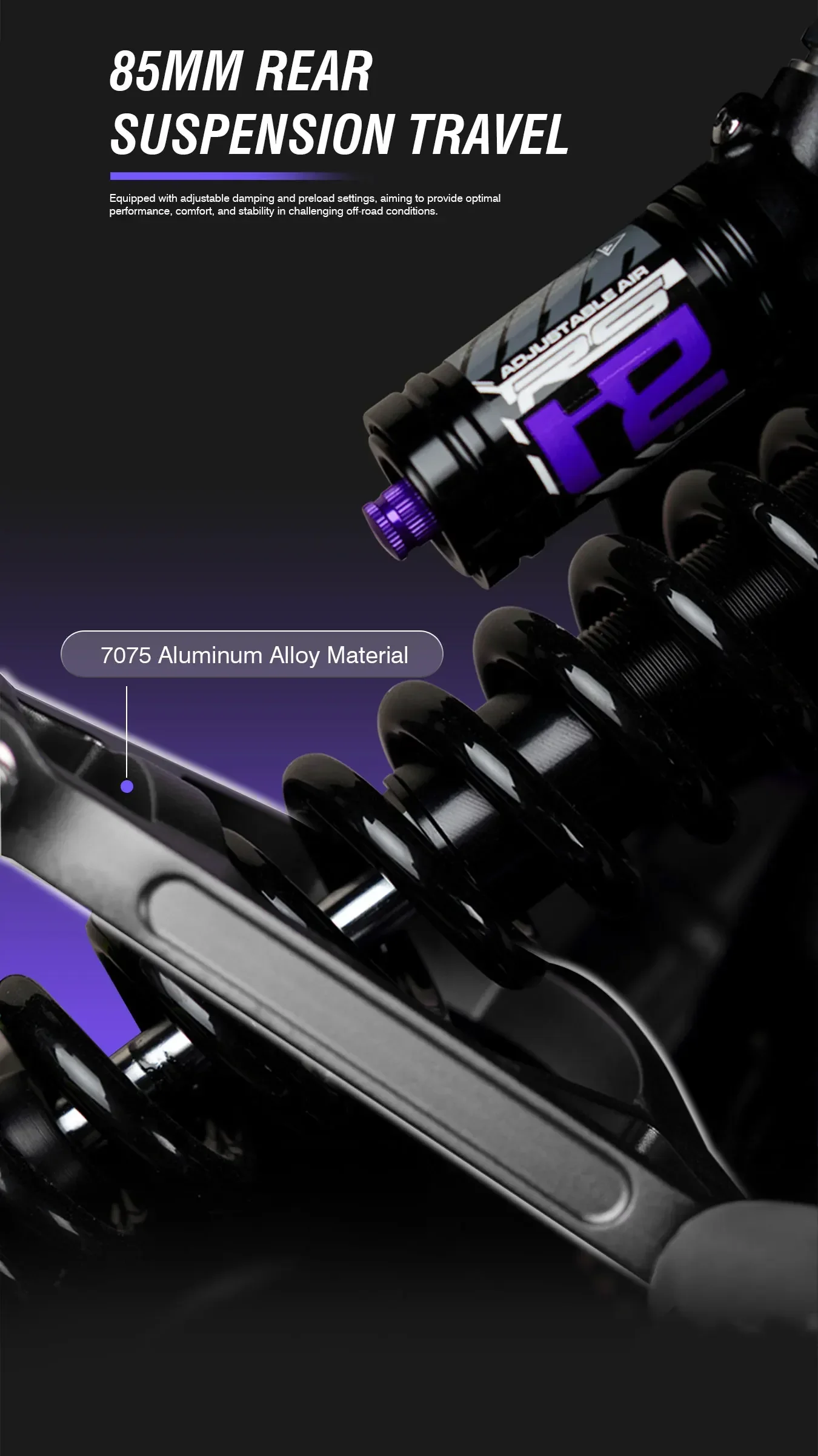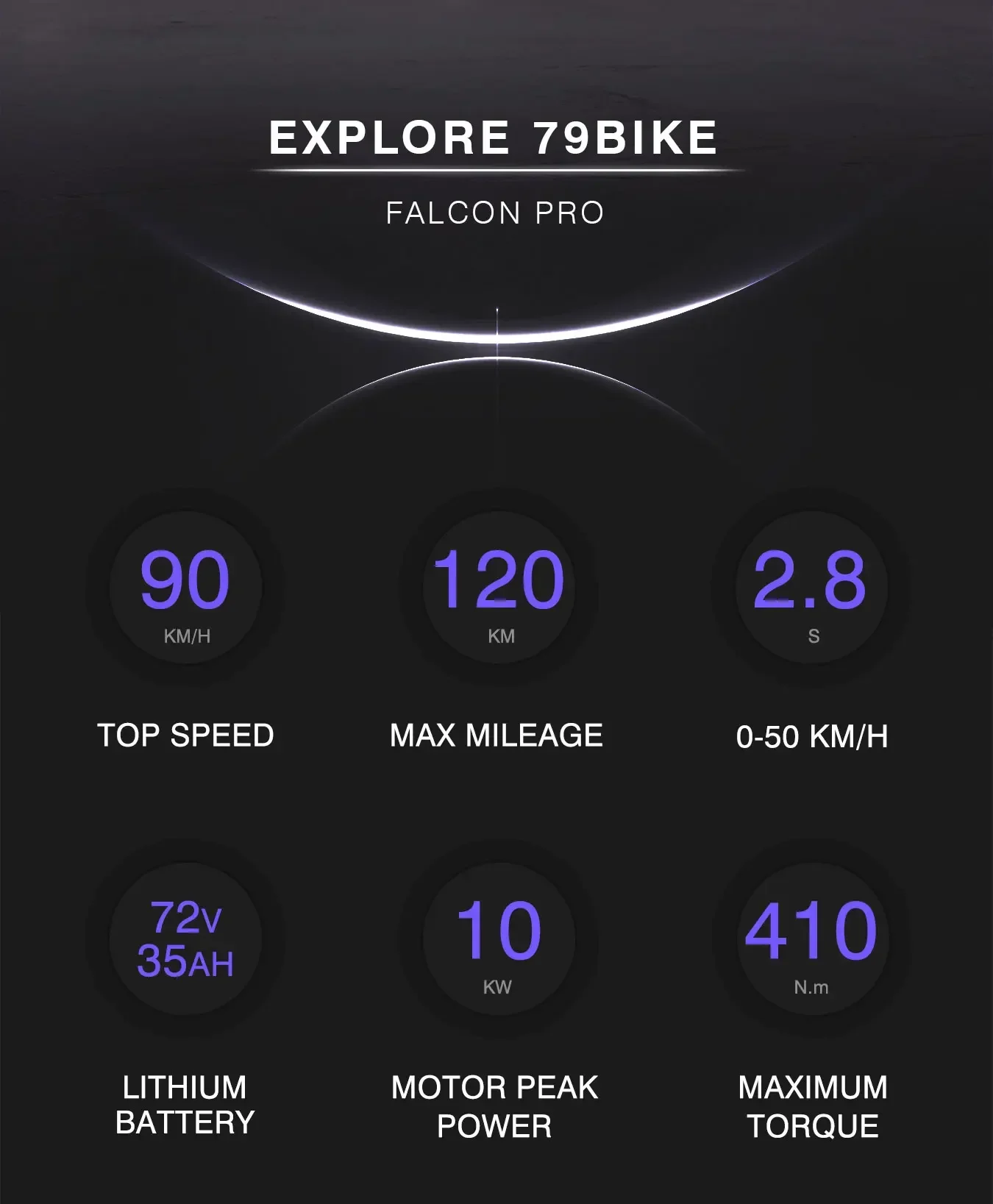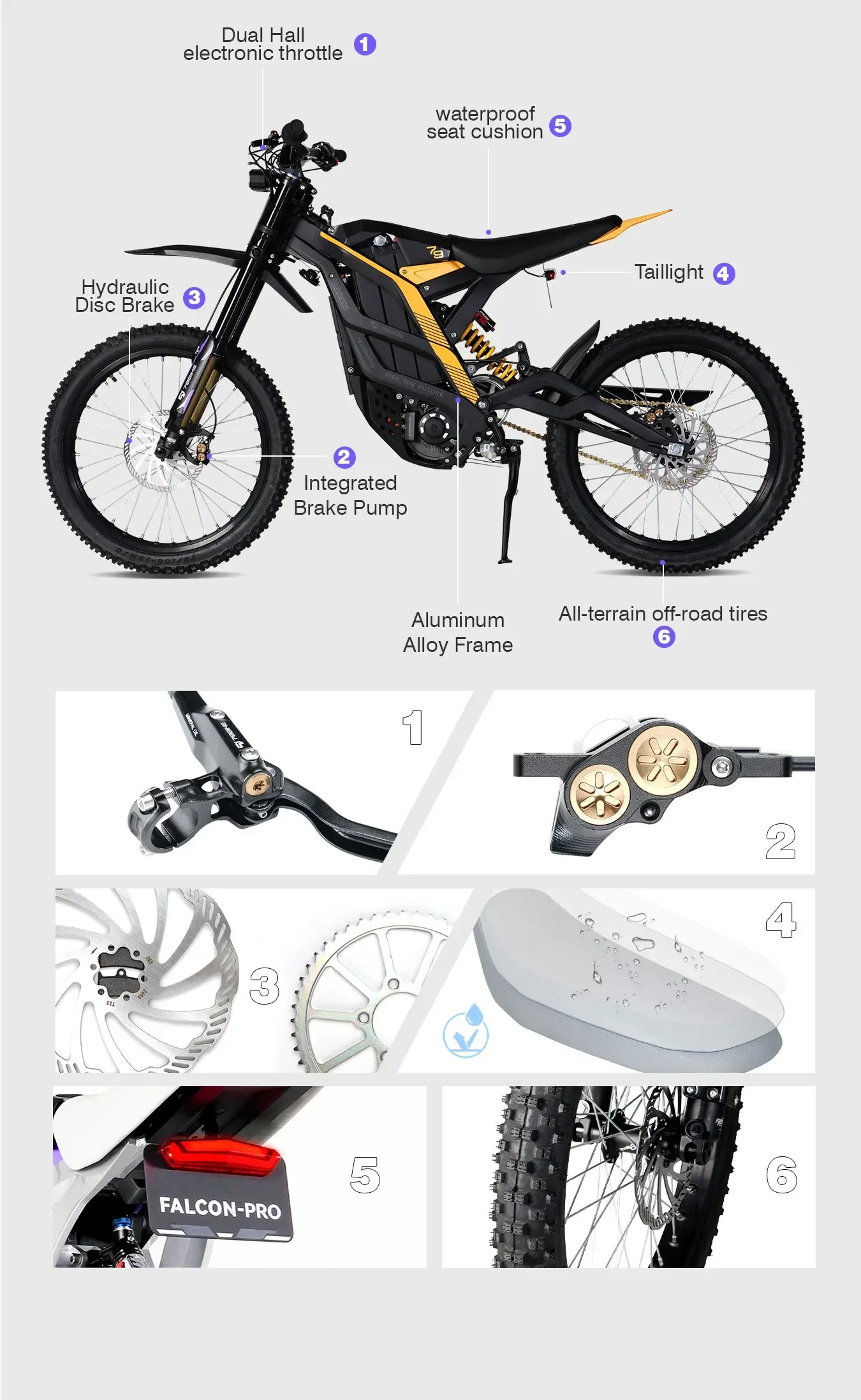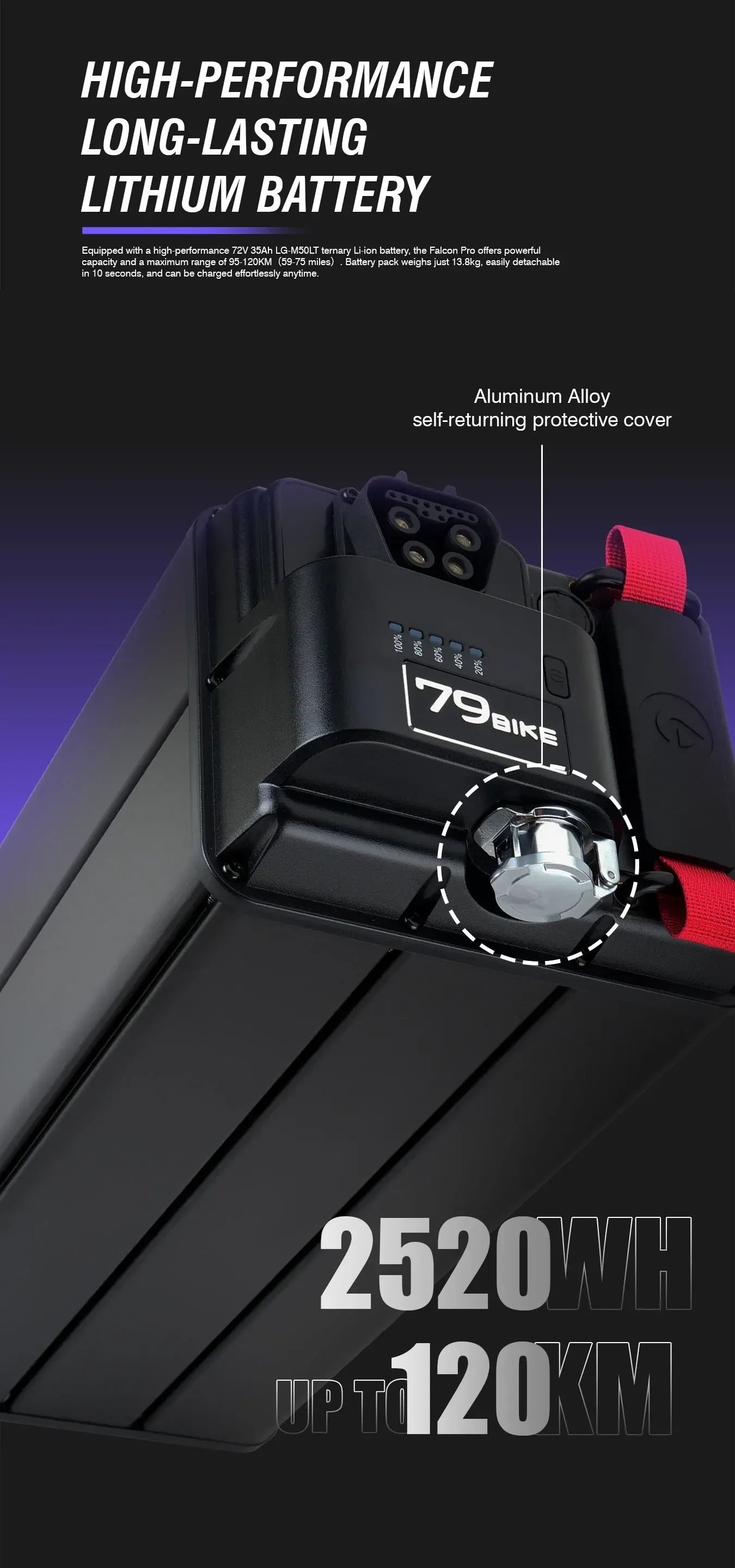 Velocidad y rango inigualables:Equipado con una batería ternaria de iones de litio de 72 V 35 Ah LG-M50LT de alto rendimiento, el Falcon Pro ofrece una capacidad potente y un alcance máximo de 95-120 km (59-75 millas).El paquete de baterías pesa solo 13,8 kg, se puede quitar fácilmente en 10 segundos y se puede cargar sin esfuerzo en cualquier momento.
