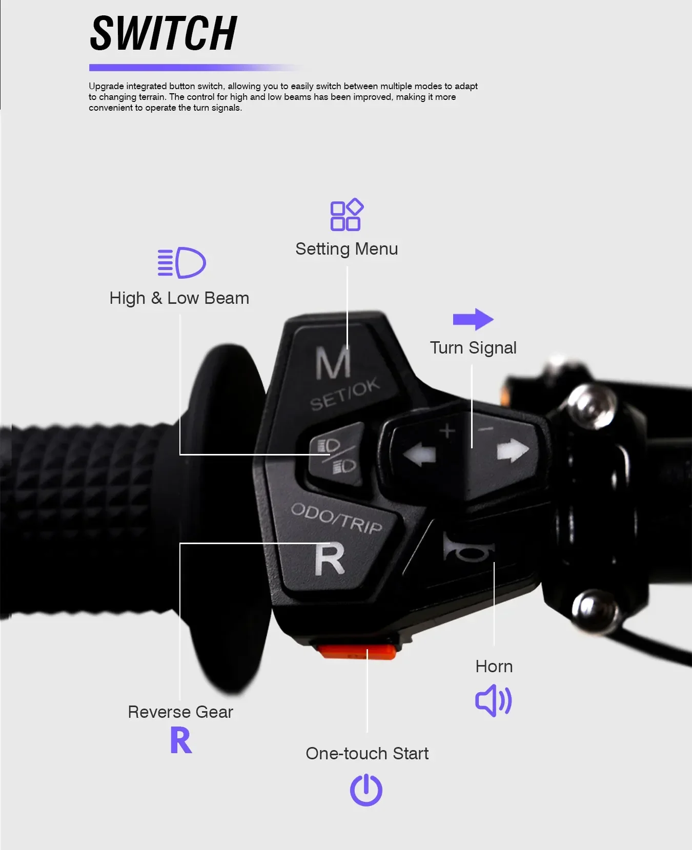 Interruptor de botón monolítico mejorado, que permite cambiar con un solo toque entre múltiples modos, lo que facilita la adaptación a los cambios del terreno.También cuenta con control secuencial de las luces altas y bajas, así como un funcionamiento más conveniente de las señales de giro.