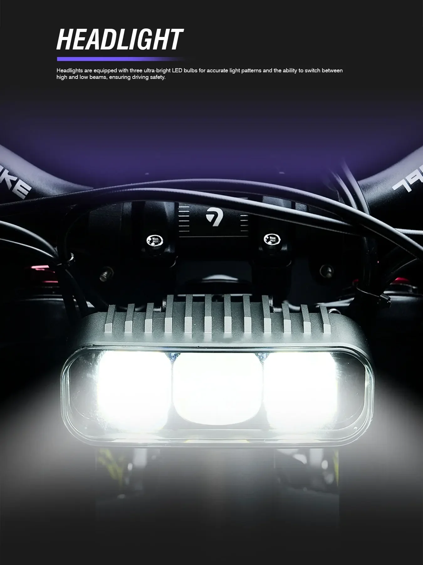 Los faros están equipados con tres LED de alto brillo para patrones de luz precisos y la capacidad de cambiar entre luces altas y bajas, garantizando la seguridad en la conducción.