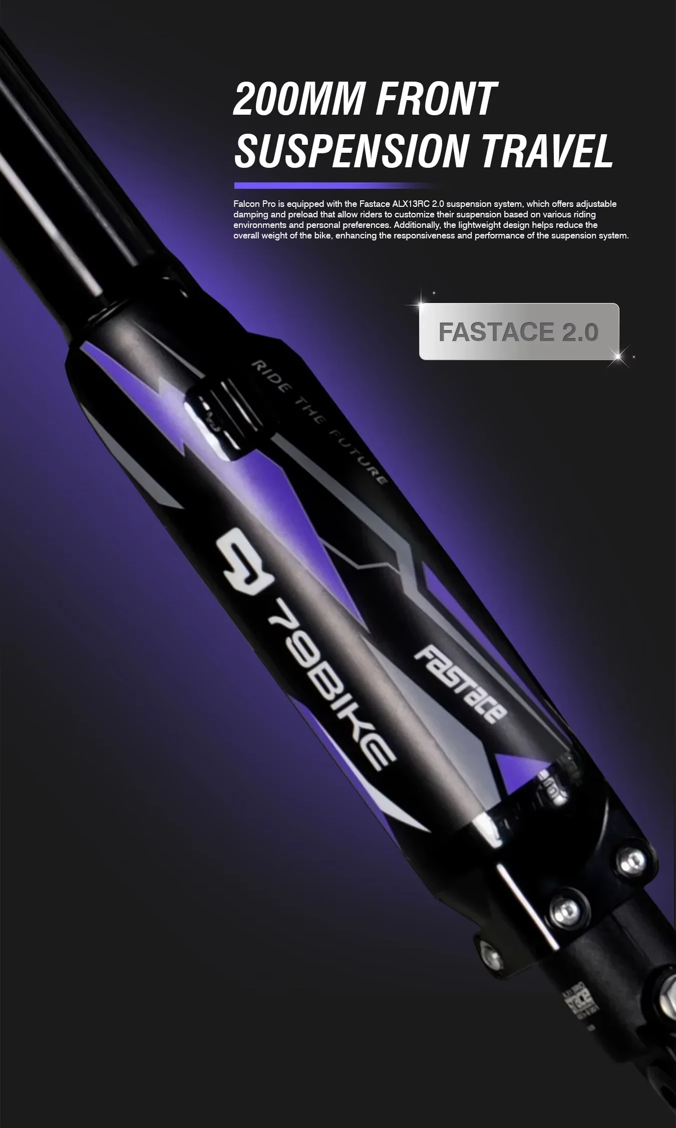 Falcon Pro está equipado con elFastace ALX13RC 2.0sistema de suspensión, que ofrece amortiguación y precarga ajustables que permiten a los ciclistas personalizar su suspensión según diversos entornos de conducción y preferencias personales.