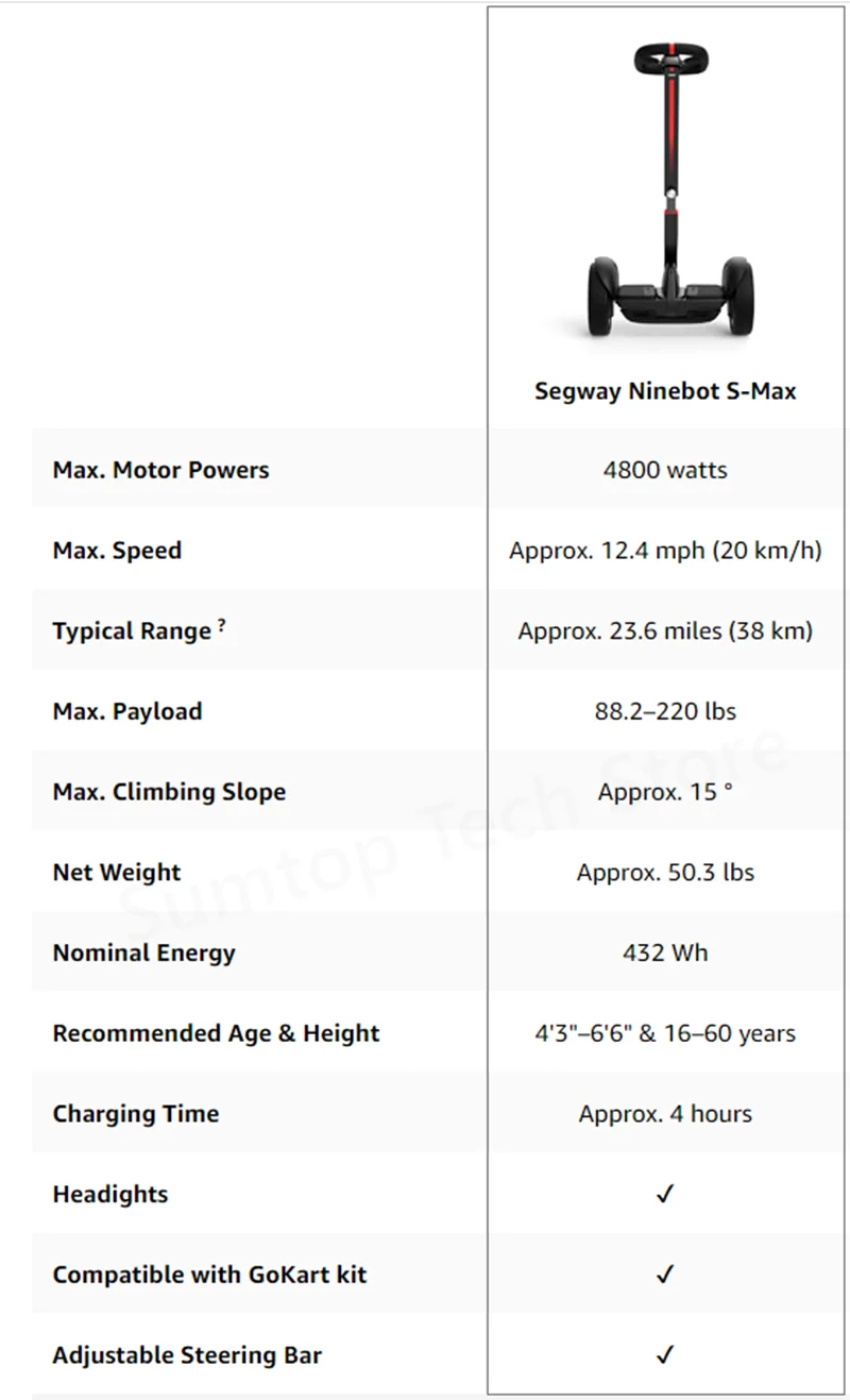 Ninebot S MAX está equipado con dos motores de cubo y una batería refrigerada por aire de 432 Wh.Con una potencia máxima del motor de 4.800 W y un par máximo de 96 Nm, el inteligente Ninebot S MAX hace que conducir sea más emocionante que nunca.Ofrece una velocidad máxima de 12,4 mph y un diseño elegante.Diseñado para un transporte práctico de última milla y una movilidad de entretenimiento, Ninebot S MAX lo lleva a su destino mientras disfruta del momento.