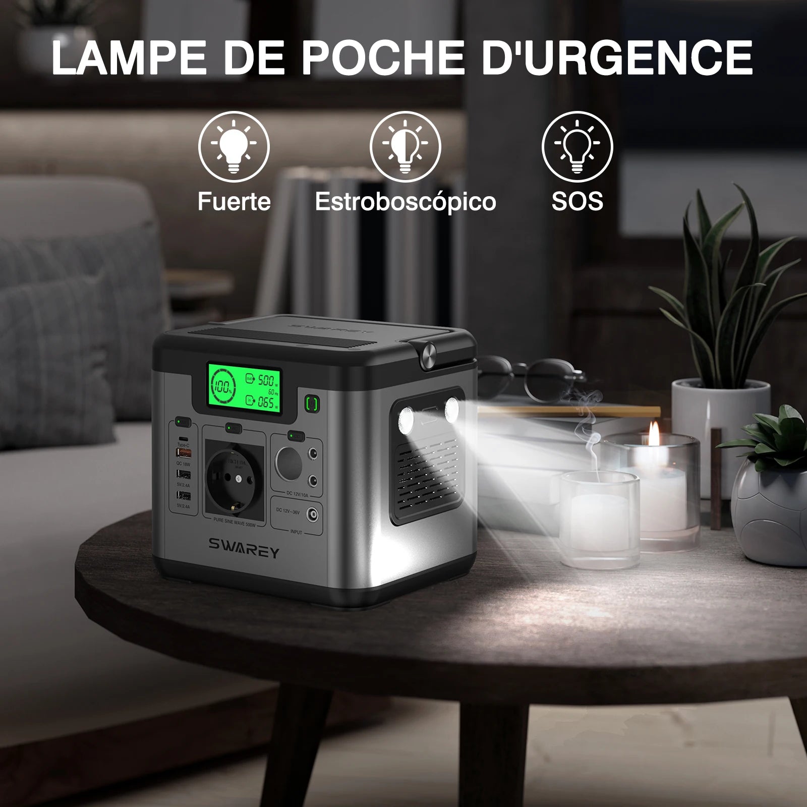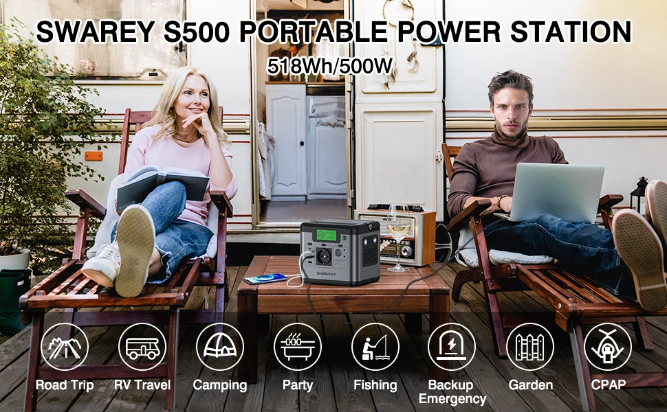 SWAREY S500 Pro 500W (1000W Pico) Estación de energía 518Wh Generador solar Cargador de energía de respaldo para el hogar Banco de energía con panel solar de 100W