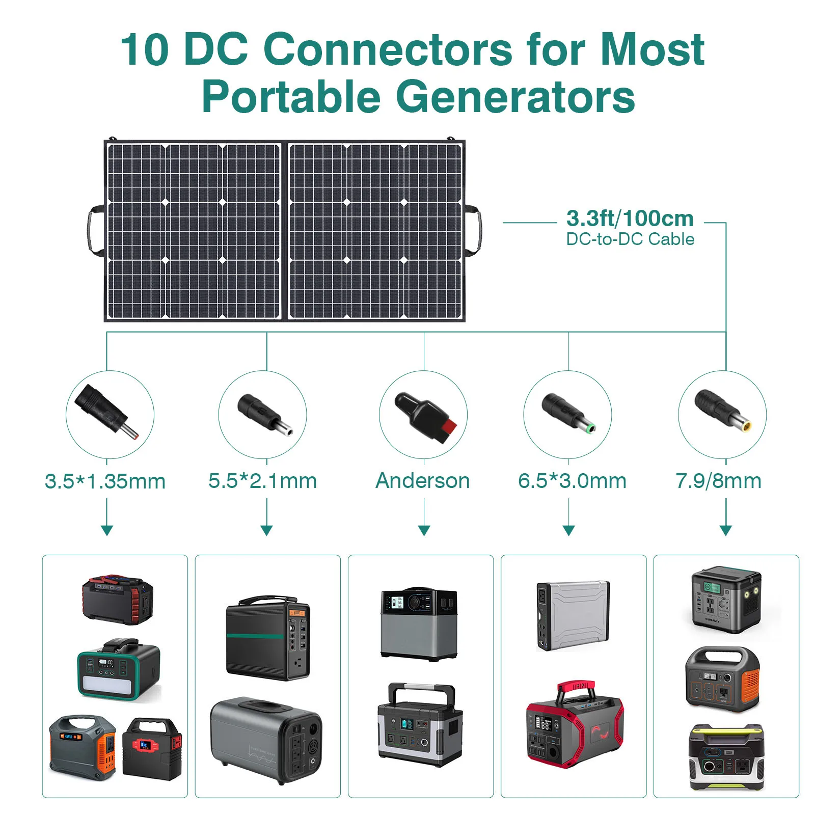 COMPATIBILIDAD VAST:El panel solar está equipado con 10 tamaños diferentes de conectores de CC, que pueden cargar la mayoría de los generadores portátiles para satisfacer sus necesidades de carga.